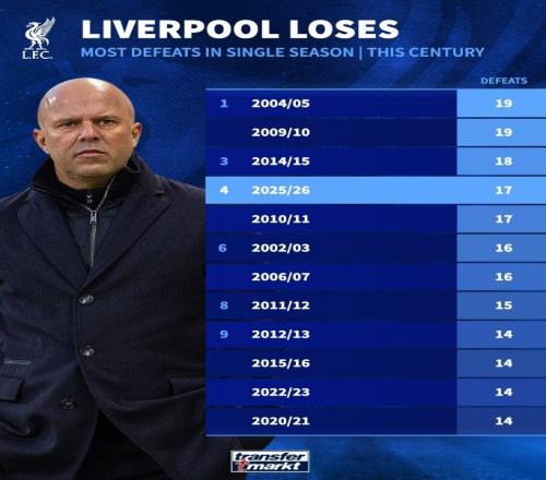 本世紀(jì)利物浦單賽季輸球場次榜:最多19場,本賽季已17場排第四 Instagram 2026-04-09 07:34:50 體育播報4月9日宣 在歐冠淘汰賽首回合,利物浦0-2不敵巴黎。這是利物浦本賽季各項賽事第17場失利,以下為利物浦本世紀(jì)單賽季輸球場次榜:1、04/05賽季、09/10賽季 19場3、14/15賽季 18場4、25/26賽季、10/11賽季 17場6、02/03賽季、06/07賽季 16場8、11/12賽季 15場9、12/13賽季、15/16賽季、22/23賽季、20/21賽季 14場足球免費觀看_利物浦免費觀看_英超免費觀看_足球高清在線_利物浦高清在線_英超高清在線 足球 利物浦 英超 上一篇: 克瓦拉茨赫利亞:安菲爾德的氣氛會很震撼,我們必須做好準(zhǔn)備 下一篇: 范戴克:五后衛(wèi)因巴黎球員跑動非常多科納特的鏟球非常漂亮