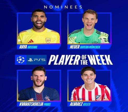 歐冠1/4決賽首回合4場比賽全部戰(zhàn)罷,歐冠官方公布了本周最佳球員候選名單,分別是戴維-拉亞、諾伊爾、克瓦拉茨赫利亞和阿爾瓦雷斯。