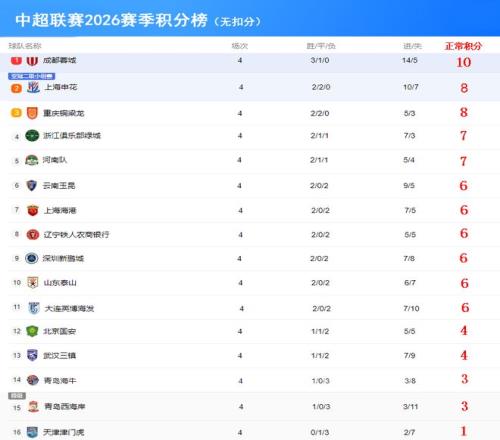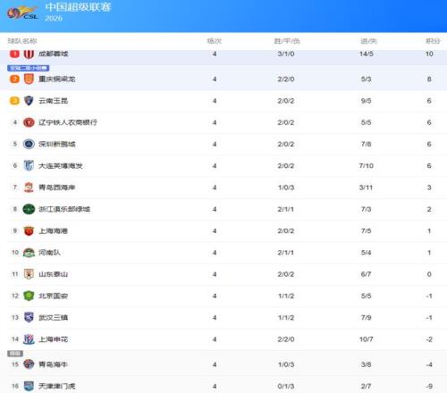 2026賽季中超聯(lián)賽前4輪戰(zhàn)罷,看著這個有提前扣分的積分榜(下圖),有的球隊歡喜,有的球迷悲傷。成都蓉城無疑是大贏家,前4輪3勝1平保持不敗,以10分高居中超積分榜榜首。升班馬重慶銅梁龍成為一匹黑馬,2勝2平同樣以不敗的戰(zhàn)績屈居積分榜第二。中超二年級生云南玉昆也表現(xiàn)搶眼,2勝2負積6分排在第三。