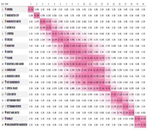 Opta Analyst:下賽季英超排名前5的球隊(duì)可以參加歐冠,超級(jí)計(jì)算機(jī)預(yù)測曼聯(lián)有95%的幾率拿到歐冠的門票。
