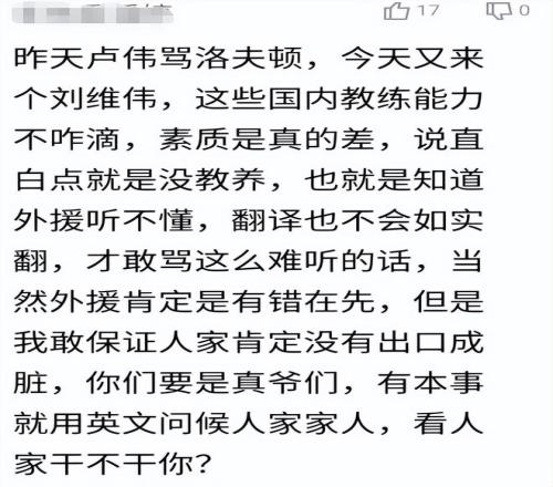 昨天盧偉罵洛夫頓,今天又來個劉維偉,這些國內(nèi)教練能力不咋滴,素質(zhì)是真的差,說直白點(diǎn)就是沒教養(yǎng),也就是知道外援聽不懂,翻譯也不會如實(shí)翻,才敢罵這么難聽的話,當(dāng)然外援肯定是有錯在先,但是我敢保證人家肯定沒有出口成臟,你們要是真爺們,有本事就用英文問候人家家人,看人家干不干你?