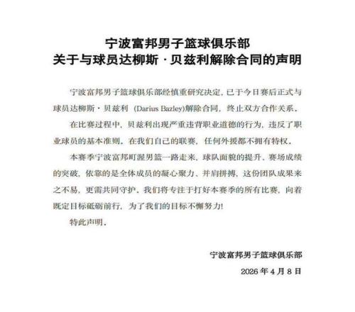 比賽結(jié)束后,寧波男籃快速反應(yīng),宣布與貝茲利解約。球隊(duì)在官方聲明中表示:寧波富邦男子籃球俱樂(lè)部經(jīng)慎重研究決定,已于今日賽后正式與球員達(dá)柳斯·貝茲利(Darius Bazley)解除合同,終止雙方合作關(guān)系。在比賽過(guò)程中,貝茲利出現(xiàn)嚴(yán)重違背職業(yè)道德的行為,違反了職業(yè)球員的基本準(zhǔn)則。在我們自己的聯(lián)賽,任何外援都不擁有特權(quán)。