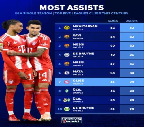 奧利塞目前排名第七,但他本賽季只需要再送出4次助攻就能打破紀(jì)錄。拜仁在德甲還有六輪比賽,加上還要征戰(zhàn)歐冠和德國(guó)杯,奧利塞破紀(jì)錄看來(lái)只是時(shí)間問(wèn)題。