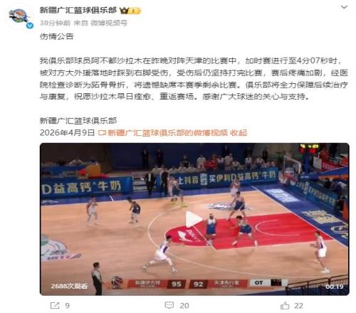 具體公告:阿不都沙拉木在昨晚對(duì)陣天津的比賽中,加時(shí)賽進(jìn)行至4分07秒時(shí),被對(duì)方大外援落地時(shí)踩到右腳受傷,受傷后仍堅(jiān)持打完比賽,賽后疼痛加劇,經(jīng)醫(yī)院檢查診斷為跖骨骨折,將遺憾缺席本賽季剩余比賽。