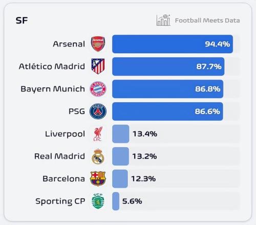 雖然大數(shù)據(jù)預測里,利物浦的晉級可能性比巴薩多了1個百分點,但這無非是因為利物浦擁有主場優(yōu)勢。巴薩落后2球,還要去客場。晉級概率跟回到主場的利物浦,以及落后1球的皇馬很接近,這也說明,巴薩在實力上比馬競還是有優(yōu)勢。
