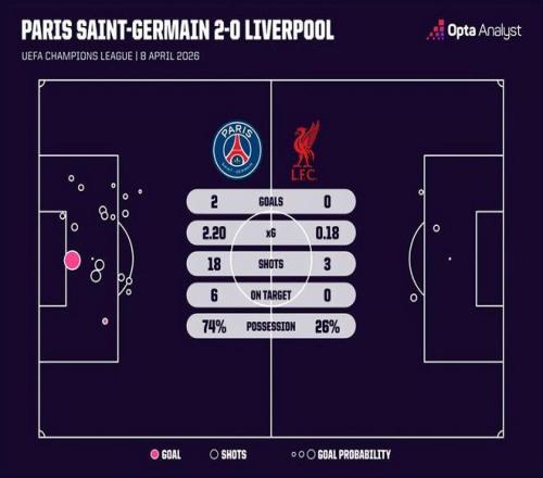 相比之下,利物浦輸?shù)眠€是很徹底的,雖然只是丟了2球,不過場面上的差距巨大。射門數(shù)18比3,射正數(shù)6比0,絕佳得分機會4比0,預期進球2.2比0.18,利物浦甚至達不到巴黎的一個零頭。