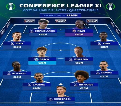 德轉(zhuǎn)公布?xì)W協(xié)聯(lián)1/4決賽身價(jià)最高十一人