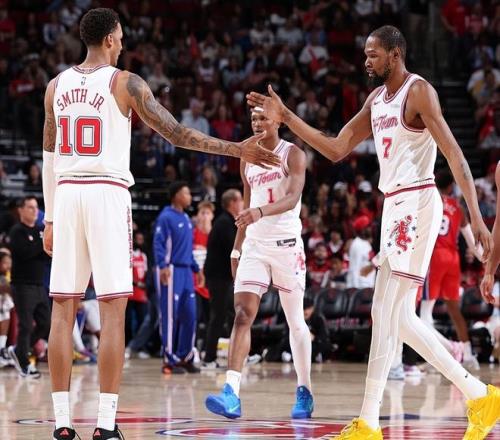 北京時(shí)間4月10日,NBA常規(guī)賽繼續(xù)進(jìn)行,費(fèi)城76人隊(duì)前往客場挑戰(zhàn)休斯頓火箭隊(duì)。火箭隊(duì)正處于7連勝中,這是聯(lián)盟現(xiàn)存第2長連勝紀(jì)錄,僅次于掘金隊(duì)的10連勝。烏度卡主動(dòng)變陣將奧科吉提到首發(fā)陣容,火箭首發(fā)五虎為杜蘭特+申京+阿門+史密斯+奧科吉。76人隊(duì)正處于2連敗中,大帝因接受闌尾炎手術(shù)無法出戰(zhàn),76人隊(duì)首發(fā)五虎為馬克西+喬治+埃奇庫姆+烏布雷+博納。