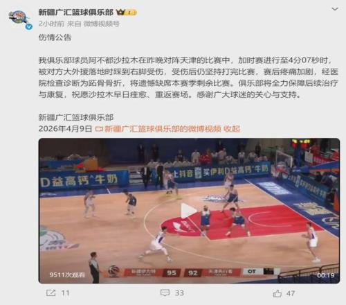 北京時(shí)間4月9日晚,CBA新疆男籃官方宣布:阿不都沙拉木在對(duì)陣天津的比賽中,被對(duì)方大外援落地時(shí)踩到右腳受傷,診斷為跖骨骨折,本賽季正式報(bào)銷。本賽季CBA常規(guī)賽只有42輪,目前新疆男籃13勝23負(fù),僅排聯(lián)賽第15位。