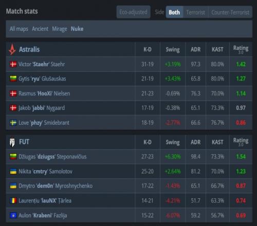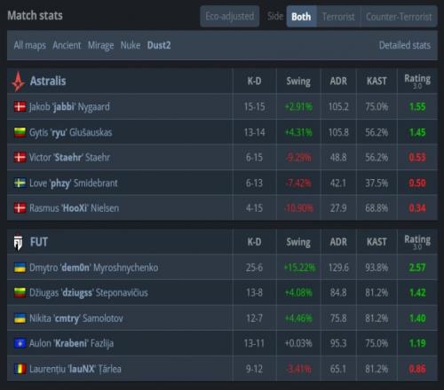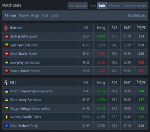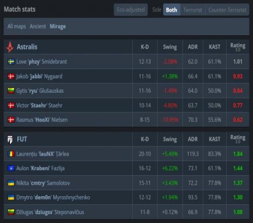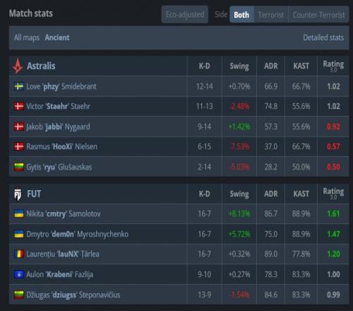 易邊再戰(zhàn),手槍局CT對(duì)槍ryu與phzy各取雙殺幫助A隊(duì)拿到第3分。FUT次回合強(qiáng)起失敗,A隊(duì)連拿3分。第16回合長(zhǎng)槍局,A隊(duì)B二樓魚貫進(jìn)點(diǎn)遭挨個(gè)槍斃,F(xiàn)UT拿到第11分后輕松拿到賽點(diǎn),最終phzy一把tec-9三殺無力回天,F(xiàn)UT以13-5贏下圖二拿到賽點(diǎn)。