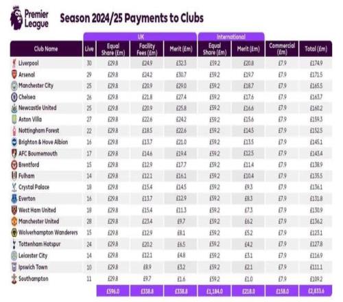 作為世界足壇商業(yè)價(jià)值的扛把子,英超官方于2023年宣布:將2025-2029賽季的轉(zhuǎn)播權(quán)賣給skysport、TNT,集錦出售給BBC之后,四年內(nèi)帶來(lái)總計(jì) 67 億英鎊的收入。平均每年的轉(zhuǎn)播收入就能達(dá)到約16.75億英鎊,而上賽季,英超的轉(zhuǎn)播及商業(yè)總收入高達(dá)28.3億英鎊,而這筆錢的分配模式如下:50%基礎(chǔ)收入(20支球隊(duì)均分)+25%排名獎(jiǎng)金+25%轉(zhuǎn)播場(chǎng)次收入(設(shè)施費(fèi))。英超官方表示,這種模式確保了聯(lián)賽中資金分配的公平性。