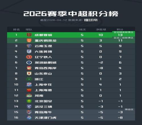 中超第5輪結(jié)束,成都蓉城客場2-1絕殺北京國安,目前積13分繼續(xù)排名榜首,重慶銅梁龍和云南玉昆同樣贏球,繼續(xù)位列2、3位。此外,上海申花在德比戰(zhàn)中擊敗上海海港,積分成功轉(zhuǎn)正。