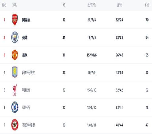 在積分榜上,阿森納21勝7平4負(fù),拿到70分,排名榜首。曼城贏球之后,縮小了與阿森納的差距。曼城64分,排名第2,在少賽一場(chǎng)的情況下落后阿森納6分。曼聯(lián)55分排名第3。阿斯頓維拉也是55分,排名第4。利物浦52分,排名第5。輸球的切爾西依然是48分,排名第6。熱刺只拿到30分,排名第18,深陷降級(jí)區(qū)。