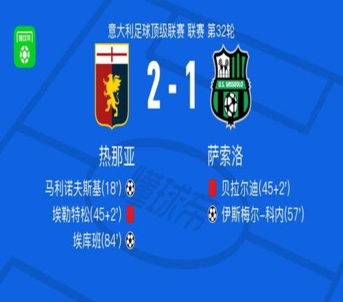 北京時(shí)間4月12日意大利足球甲級(jí)聯(lián)賽第32輪,熱那亞主場(chǎng)對(duì)陣薩索洛。 比賽中,熱那亞球員率先取得進(jìn)球,隨后兩隊(duì)各有球員在半場(chǎng)結(jié)束階段被紅牌罰下。易邊再戰(zhàn),薩索洛球員扳回一球,熱那亞球員之后再入一球鎖定優(yōu)勢(shì)。 最終比分熱那亞2-1薩索洛。