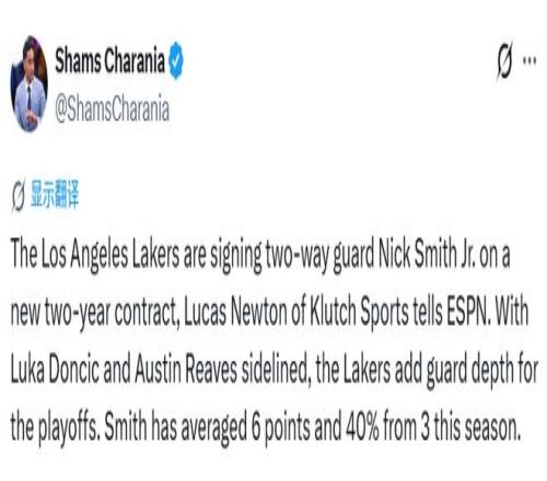 北京時(shí)間4月12日,據(jù)名記Shams報(bào)道,洛杉磯湖人隊(duì)將與雙向后衛(wèi)小尼克-史密斯簽下一份為期兩年的新合同。由于東契奇和里夫斯缺陣,湖人此舉是為季后賽補(bǔ)充后衛(wèi)深度。這也意味著他填補(bǔ)了之前裁掉巴夫金騰出的名額,成為了湖人季后賽名單的第15人。