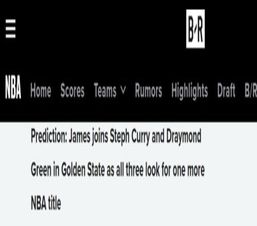 美媒Bleacher Report表示,如果詹姆斯不回歸湖人,勇士將是他最有可能的下家。該媒體預(yù)測(cè)詹姆斯加盟勇士,與庫里、追夢(mèng)聯(lián)手,三人共同沖擊又一座總冠軍獎(jiǎng)杯。