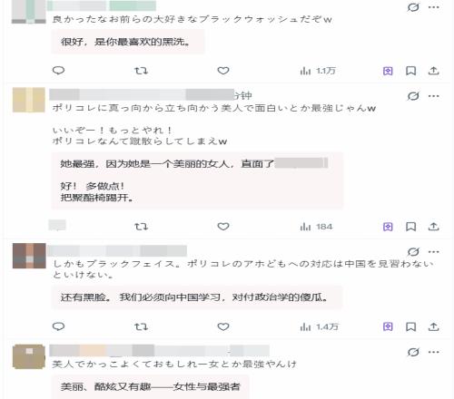 “長(zhǎng)得美還這么有趣,甚至正面迎擊政治正確,簡(jiǎn)直無(wú)敵了(笑)。好樣的!再多干點(diǎn)!把政治正確什么的都踢飛吧(笑)?!?/p>