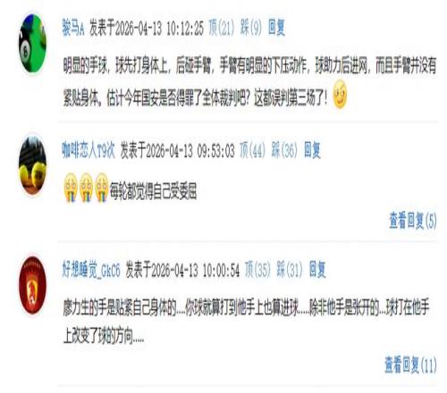 有球迷表示,明顯的手球,球先打身體上,后碰手臂,手臂有明顯的下壓動(dòng)作,球助力后進(jìn)網(wǎng),而且手臂并沒有緊貼身體,估計(jì)今年國(guó)安是否得罪了全體裁判吧?這都誤判第三場(chǎng)了!還有球迷表示,廖力生的手是貼緊自己身體的….你球就算打到他手上也算進(jìn)球…..除非他手是張開的……