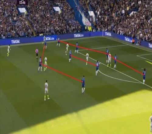 在這之前,他一直在嘗試四中場的思路,甭管是恩佐打邊,還是帕爾默打邊,思路都是以此來建構(gòu)潛在的三、四后衛(wèi)切換和中場優(yōu)勢,從而打出兩條邊路的進(jìn)攻。