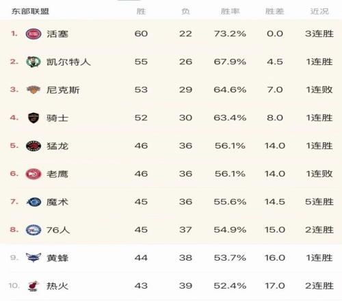 活塞依舊東部第一,凱爾特人在次席