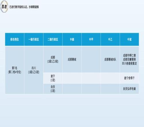 四川省與北京市并列為第二檔的4號(hào)位(總第7名),同樣擁有1超1乙5冠共7隊(duì),成都市(1超1乙3冠)是帶隊(duì)核心,遂寧市(遂寧舍得干)和自貢市(自貢弘祥電碳)是左膀右臂。