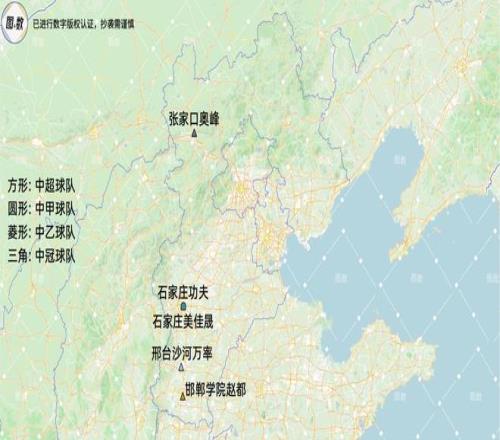 河北省是第三檔的4號(hào)位(總第16名),它擁有1甲4冠共5支球隊(duì),分布在石家莊、張家口、邢臺(tái)和邯鄲,有趣的是,這四座城市幾乎連成南北一線,都處在東經(jīng)114.5度左右。
