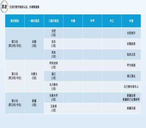 安徽、內(nèi)蒙古和新疆并列為第五檔的1號(hào)位(總第23名),各自擁有3支中冠球隊(duì),五家渠市的新疆兵超是中國(guó)前四級(jí)足球聯(lián)賽位置最西的球隊(duì)。