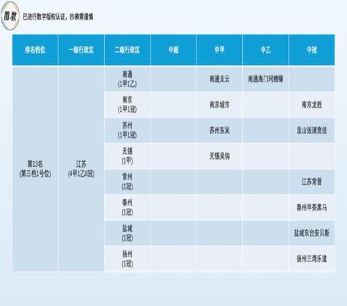 江蘇是第三檔的1號(hào)位(總第13名),它擁有4甲1乙6冠總計(jì)11隊(duì),球隊(duì)的數(shù)量?jī)H次于廣東(17隊(duì))、山東(14隊(duì))和遼寧(13隊(duì)),排在全國(guó)第四,但因暫時(shí)沒(méi)有中超球隊(duì),所以只能蟄居第三檔。