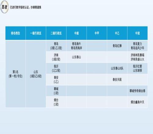 山東省是第一檔1號(hào)位(總第1名),雖然它的前四級(jí)球隊(duì)總數(shù)(14隊(duì))只能排第二(第一是擁有17隊(duì)的廣州),但因?yàn)閾碛卸噙_(dá)3支中超球隊(duì),山東依然穩(wěn)穩(wěn)占據(jù)全國(guó)足球綜合競(jìng)技實(shí)力的頭把交椅,六座城市排出了3超3乙8冠的陣容,青島(5隊(duì))、濟(jì)南(3隊(duì))和臨沂(3隊(duì))是山東足球的三駕馬車(chē)。
