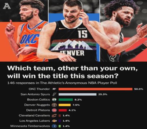 4月13日,NBA常規(guī)賽落幕,美國知名媒體《The Athletic》發(fā)布一項球員匿名調查,問題為:“除了自己球隊,你認為哪支球隊能奪冠?”,結果在146份調查中,雷霆被50%的球員認為能奪冠,遠遠領先第二名馬刺的25.3%。