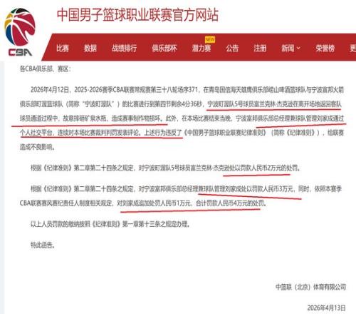 再加上,劉家成是寧波隊CBA聯(lián)賽賽風(fēng)賽紀責(zé)任人,因此,再對劉家成罰款10000元。就這樣,CBA公司對劉家成罰款40000元。