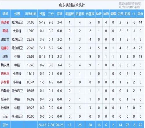 山東隊(duì)珀塞爾22分3籃板5助攻,瓊斯19分9籃板,高詩巖14分5籃板8助攻4搶斷,謝智杰8分4籃板,約翰遜6分,陶漢林3分9籃板,其余球員得分寥寥。