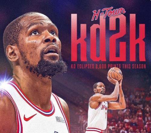 火箭在去年夏天完成大交易,送走杰倫-格林與狄龍,引進37歲的老將杜蘭特。本賽季杜蘭特代表火箭出場78場比賽,場均得到26分5.5籃板4.8助攻,成為火箭的隊內得分王,且比隊內第二多的申京場均多出5.6分。