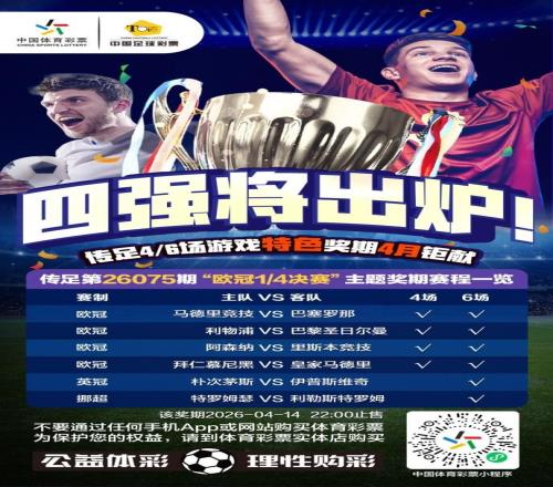 第26075期傳足4/6場(chǎng)游戲特色獎(jiǎng)期已經(jīng)于2026年4月12日20:00開(kāi)售,將于2026年4月14日22:00停售,并于2026年4月16日開(kāi)獎(jiǎng),其中馬德里競(jìng)技VS巴塞羅那、利物浦VS巴黎圣日爾曼、阿森納VS里斯本競(jìng)技、拜仁慕尼黑VS皇家馬德里為4場(chǎng)進(jìn)球游戲競(jìng)猜賽事。