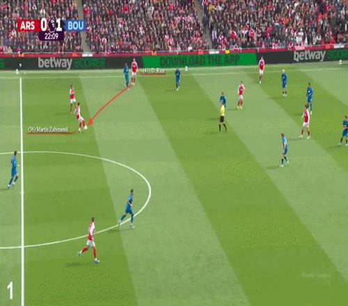當從賴斯那里接到球后,他向前觀察并希望有一個出球點。馬丁內(nèi)利、哲凱賴什和哈弗茨幾乎沒有任何跑動,伯恩茅斯的防線穩(wěn)如磐石。蘇比門迪被迫自己轉(zhuǎn)身,再次尋求出球點,最后將球分給了身邊的劉易斯-斯凱利。