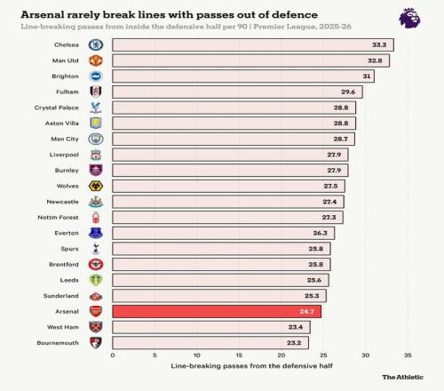 下面的柱狀圖顯示,本賽季阿森納在本方半場內(nèi)完成的穿透防線的傳球次數(shù)極少,只有西漢姆聯(lián)和伯恩茅斯比他們更少。雖然這項數(shù)據(jù)有一些限制條件(對手可能不會像對其他球隊那樣以同樣的強度壓迫阿森納,從而減少了他們傳出穿透球的機會),但它確實表明,阿森納在從后防線上送出犀利傳球方面遇到了困難。那種通過三線之間一腳傳球快速推進的日子,感覺已經(jīng)是很久以前的事了。