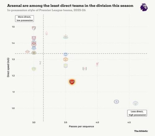 從下面的可視化圖表可以看出,阿森納是聯(lián)賽中控球時更有耐心的球隊之一。本賽季許多球隊都傾向于用很少的傳球打直接足球,而曼城和切爾西等球隊則繼續(xù)進行著長傳次數(shù)的配合。在賽季這么晚的階段,徹底改變風格不太可能,但“踢得快”并不總是意味著“踢得直接”。