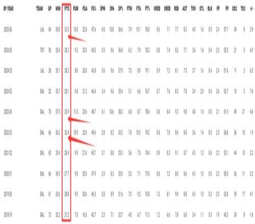 這也是東契奇職業(yè)生涯第三次場(chǎng)均30+,第一次是22-23賽季場(chǎng)均32.4分,第二次23-24賽季場(chǎng)均33.9分,第三次25-26賽季場(chǎng)均33.5分,也就是這三次場(chǎng)均得分都超過了32+。