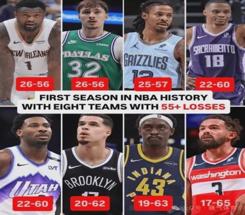 4月14日,美國(guó)媒體ESPN公布一則數(shù)據(jù),NBA在本賽季首次出現(xiàn)有八支球隊(duì)輸?shù)糁辽?5場(chǎng)比賽,同時(shí)有八支球隊(duì)勝率不足33%。