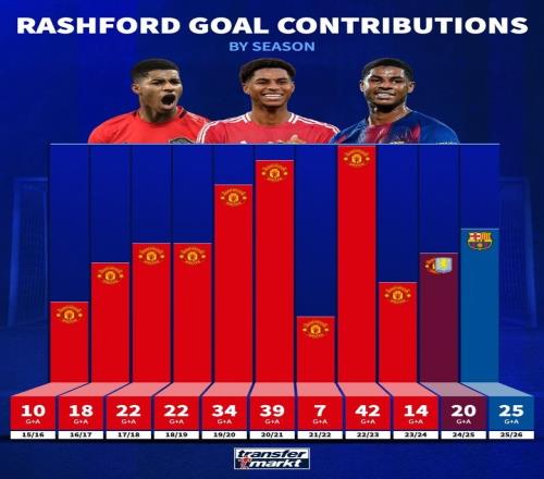 德轉(zhuǎn)列拉什福德生涯各賽季參與進球數(shù):