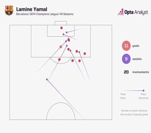 此役對(duì)陣馬德里競(jìng)技打入一球后,亞馬爾歐冠生涯33次出場(chǎng)已直接參與20球,包括11球9助。