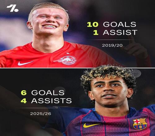 歐冠1/4決賽次回合,巴塞羅那客場(chǎng)對(duì)陣馬德里競(jìng)技,上半場(chǎng)亞馬爾破門為巴薩取得領(lǐng)先,至此,亞馬爾本賽季歐冠已直接參與10球,這使得他超越哈蘭德,成為歐冠單賽季參與進(jìn)球上雙最年輕的球員。