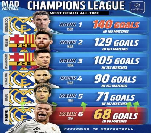 不過,單從效率來看,姆巴佩目前還沒能壓過C羅。C羅在歐冠出場183次打進140球,場均接近0.77球;而姆巴佩96場進68球,場均大約0.71球。這個差距說明,姆巴佩想沖到第一,不能只靠這幾年的火熱狀態(tài),還得靠更長時間的高出勤和產(chǎn)量去硬磨。歐冠總榜拼的是耐力,不是爆發(fā)力。只要參賽年限夠長、每年都能帶隊踢到淘汰賽深處,哪怕場均效率低一點,依然有希望靠時間把總進球數(shù)堆上去。