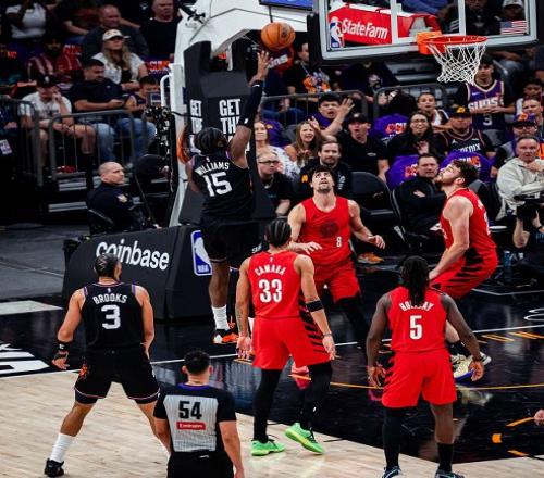 比賽開打之后,太陽全隊都找不到三分球手感,而且防守端也沒有限制住阿夫迪亞的發(fā)揮,讓后者半場就砍下了16分7助的個人數(shù)據(jù),幫助客場作戰(zhàn)的開拓者,一度建立起了14分的領(lǐng)先優(yōu)勢,逆境中太陽雙子星開始爆發(fā),布克半場飆下16分,杰倫格林更是里突外投兩節(jié)砍下22分,幫助太陽半場結(jié)束前,將比分追至62-65。