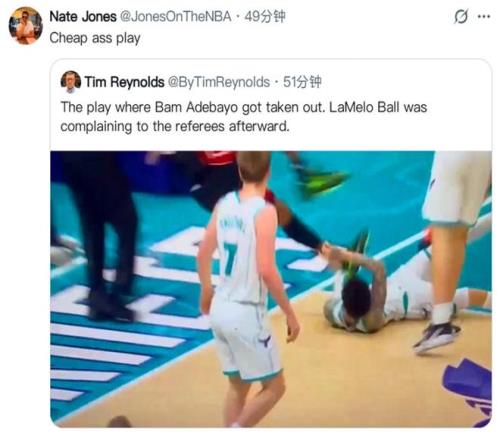 這一幕發(fā)生在第二節(jié)還剩11分鐘時(shí),三球在突破過程中失衡倒地,隨后拉拽阿德巴約腳后跟,導(dǎo)致后者摔倒在地,痛苦捂著尾椎骨。