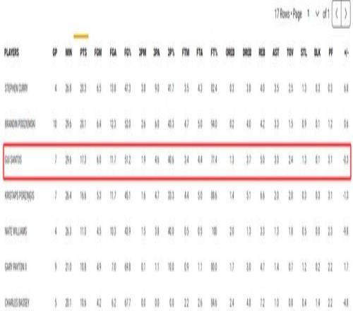 桑托斯全場(chǎng)比賽32分鐘,13中9,三分4中2,拿到20分7籃板5助攻1搶斷,命中率69.2%,三分命中率50%,真實(shí)命中率76.9%,正負(fù)值+16勇士全隊(duì)第一。