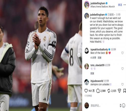 體育播報(bào)4月18日宣 本輪歐冠八強(qiáng)戰(zhàn)次回合,皇馬在客場3-4被拜仁雙殺。中場貝林厄姆在賽后通過社媒發(fā)文。