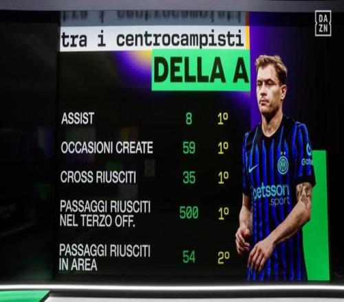 根據(jù)DAZN的統(tǒng)計,巴雷拉本賽季在意甲8次助攻、創(chuàng)造59次機會、完成35次成功傳中以及完成500次進攻三區(qū)內(nèi)的傳球均位列聯(lián)賽同期所有中場球員的第一位。此外,巴雷拉還有54次傳至禁區(qū)內(nèi)的成功傳球,這位列聯(lián)賽同期所有中場的第二位。