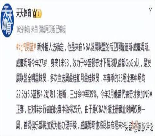 今年2月他曾代表奇才參加NBA正賽,在對陣步行者的比賽中獨(dú)得25分。由于距CBA外援注冊截止時間僅剩一周,首鋼俱樂部將加緊為他辦理手續(xù),威廉姆斯也將盡快啟程來華。