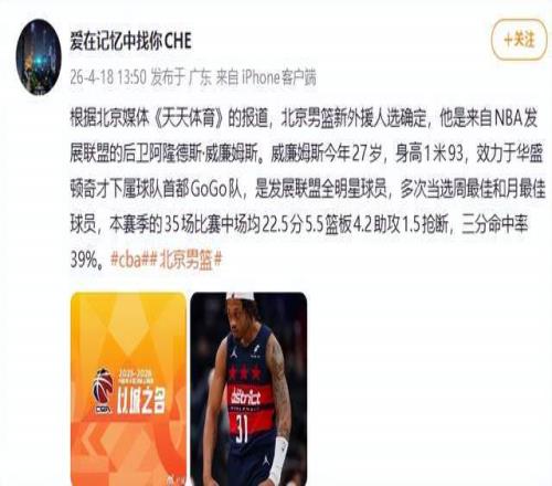 北京時(shí)間4月18日消息,北京首鋼在常規(guī)賽收官階段完成關(guān)鍵補(bǔ)強(qiáng),正式簽下前NBA球員阿隆德斯·威廉姆斯,標(biāo)志著貝利的離隊(duì)進(jìn)入倒計(jì)時(shí)。作為球隊(duì)本賽季最后一筆外援注冊(cè),威廉姆斯能否及時(shí)完成手續(xù)并出戰(zhàn)季后賽,將成為首鋼沖擊總冠軍的決定性變量。